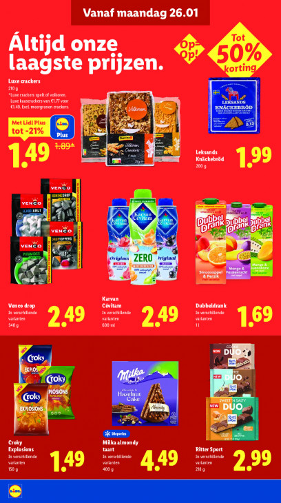 Deze tekst wordt automatisch gegenereerd, dus deze kan fouten bevatten.Vanaf maandag 26.01 Tot Altijd onze 50% orting laagste prijzen. Luxe crackers AU) CE CE LAC Luxe kaascrackers van €1.77 voor An €1.49. Excl. meergranen crackers. Ua Met Lidl Plus x 4 d tot -21% En, Leksands 49°" Knäckebrôd 99 2009 VENCO VENCO earn mate Borsa omoovawann En f mm ve DADDMANIA Tr OMPONEUA D Se: ANIV TK NDE 1x Ci le Karvan Venco drop Cévitam Dubbeldrank PURE TEE In verschillende In verschillende varianten varianten varianten 49 3409 600 ml 249 1.69 & Pm à 4 Fu NEW, 2) > vab w ch | Croky Milka almondy Explosions taart Ritter Sport In verschillende In verschillende In verschillende varianten varianten varianten Er 150 g 4009 449 PH 2.99 Ea