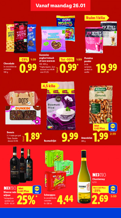 Deze tekst wordt automatisch gegenereerd, dus deze kan fouten bevatten.Vanaf maandag 26.01 aupan DAE TRES RER) (gui Ale Fe à 1 OC „5 u « ne Ay 3 Gummies yoghurtsmaak EE >> of zure wormen rot 50% EA zoe Petre poeder Chocolade 350-400 g In de In verschillende varianten varianten ACL TN wormen van €+79 FLO 99 voor €1,29. :O LE DEU E 19.9 LUN 4,5 kilo LL, XXL, AL % A À 8 IP | a DUNKIN 4: dl IN d AS « ANA Met (6 Lidl Plus Donuts 2/4 stuks per pak Bel Ci Amandelen donuts €2,99. E o Basmatirijst EL ELF} 1.99 Le NIXIS Chardonnay 0,751 ei Met L Plus NIXIS Met di Plus 25% Diverse rode wijnen Schweppes PNEU BUNTES TEN variören van varianten 69 €3,74 - €5,24 T0 6x 330 ml CE