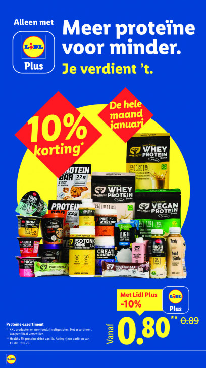 Deze tekst wordt automatisch gegenereerd, dus deze kan fouten bevatten.Alleen met Meer proteïne voor minder. Plus Je verdient ’t. 221140 maan anuar Bahn LAU 10% orting 7 PROTEIN CSS EDS AOTEIN el ma À AR 225 Lt vou at ID N Cons LES rc Sep 2 J VEGA 4 PROTEI 7 9Mi OM Tiz) er PROTEI à 22g = CRUE “x 4 NNSILEMON FLAVOLR u m arm N 7 ISOTONIK DRINK AL IGH PROTEIN @ € MONORYD! Hl mee an, — ttle ROTI AS Ee cam soc so Met Lidl Plus S -10% Plus LL] Proteïne-assortiment * XXL producten en non-food zijn uitgesloten. Het assortiment kan per filiaal verschillen. je **Healthy Fit proteïne drink vanille. Actieprijzen variëren van €0.80 - €10.79, Vanaf