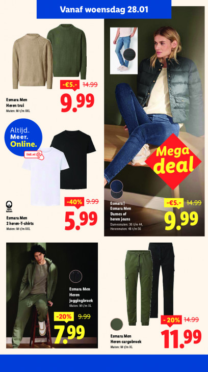 Deze tekst wordt automatisch gegenereerd, dus deze kan fouten bevatten.Vanaf woensdag 28.01 nj 4 || | | ıl EEN > Esmara Men Heren trui 99 Maten: M t/m XXL Altijd Meer. Online. ego dea u -40% Kee Sn Q 100% Esmara| CURE kaler Dames of Esmara Men heren jeans 2 heren-T-shirts Damesmaten: 36 t/m 44, LE) Maten: M t/m XXL 5 99 Herenmaten: 48 t/m 56 3 u) LT ÿ VEN U Esmara Men Heren BT LUS NGA 98 - 20% u Esmara Men NN ET Heren cargobroek 11.99 Maten: M t/m XL