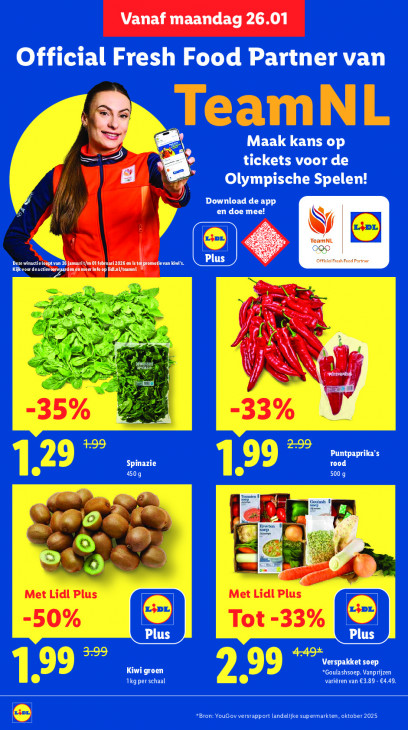 Deze tekst wordt automatisch gegenereerd, dus deze kan fouten bevatten.Vanaf maandag 26.01 Official Fresh Food Partner van Ks Al hs Maak kans op Ser =) u tickets voor de Olympische Spelen! Download de app en doe mee! Ÿ NL 4 ‚ri 2026 en is tehpromotievan kiwi' La = st & LS N er D FC EN ut Pl AN sf -35% -33% Spinazie EL roo! Puntpaprika’s Fe ET 500 g Sry: à - on, Met Lidl Plus Met Lidl Plus pe, © -50% Plus Tot -33% © Kiwi groen Verspakket soep *Goulashsoep. Vanprijzen CE 1kg per schaal 299°“ variören van €3.89 - 4.49. ;pport landelijke supermarkt ktober 2025