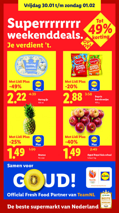 Deze tekst wordt automatisch gegenereerd, dus deze kan fouten bevatten.Vrijdag 30.01 t/m zondag 01.02 Superrrrrrrr weekenddeals. 2 Fr Po bar CC i %“ Ge Ananas an u Gala schaal 5 3 TeamNL BESTE NEDERLAND | De beste supermarkt van Nederland
