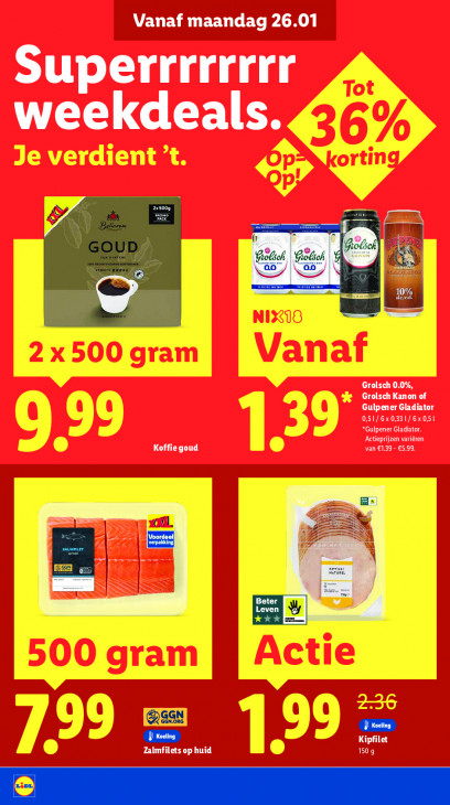 Deze tekst wordt automatisch gegenereerd, dus deze kan fouten bevatten.Vanaf maandag 26.01 Superrrrrrrr weekdeals. EEN Grolsch 0.0%, Grolsch Kanon of Gulpener Gladiator 0,51/6x0,331/6x051 Gulpener Gladiator. RCE Koffie goud van €1.39 - €5.99. D Des AZ PTE Lx led] és ww = an. GGN ea DOTE Zalmfilets op huid 1509