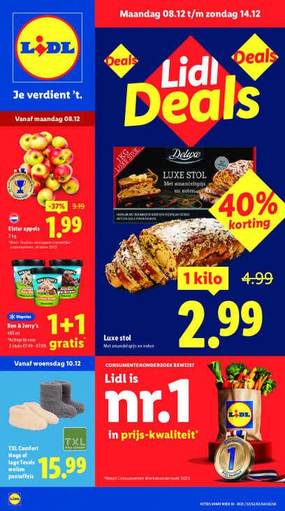 Deze tekst wordt automatisch gegenereerd, dus deze kan fouten bevatten.Maandag 08.12 t/m zondag 14.12 Tel Vanaf maandag 08.12 a‘ SÆ € 2 SY De = LUXE STOL 4 Met amandelspijs > CRUE 22 € J EE CPAS IHEERLIK MET ROOMBOTER VOOR EEN FEESTELUK ONTBUT. e Elstar appels pr: 2kg Fr. NE supermarkten, oktober 2025 ej à. Sa d GE RAS Er Ben &Jerry’s OU Luxe stol PU DT 2stuks €7.49- €7.69. EEE CONSUMENTENONDERZOEK BEWIJST Lidlis een Fi nr. 15.29 *Retail Consumenten Merkenonderzoek 2025
