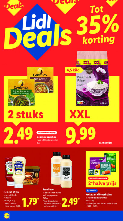 Deze tekst wordt automatisch gegenereerd, dus deze kan fouten bevatten.EL «xl, xl, xx P= Conimex de ga 2 N EON Conimex FR EV ZA Se ke aa A = -Q \ ji } 5 A Conimex boemboe In verschillende varianten Basmatirijst Er] 2 = BÂTON ak Ie re Az m = # ] = ï SAUCE D] Alle combinaties mogeljk Las Jean Bâton Heinz of Wijko In de varianten truffel, In verschillende aioli en pepersaus Kroketten of bitterballen varianten OL In verschillende varianten 400 ml/520 9 *Jean Bäton aioli en 300-840 9 *Wijko satésaus. pepersaus. Jean Bâton *Actieprizen voor 2 stuks variören van Heinz sauzen €1.99. truffelsaus €2.99. €3.89- €5.93. El