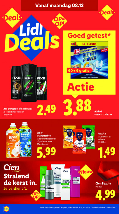 Deze tekst wordt automatisch gegenereerd, dus deze kan fouten bevatten.Vanaf maandag 08.12 3 re Pr Q 4 71 Axe showergel of deodorant In verschillende varianten All-in-1 150/250 mi vaatwastabletten a Lenor 8 AntaFlu 29 Ka AL Ed 8 In verschillende In de varianten zeebries ÿ varianten of gouden orchidee F LU 87 wasbeurten Be Er m we = en tralend de kerst in. | Per stuk Cien Beauty — T7 eme