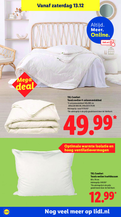 Deze tekst wordt automatisch gegenereerd, dus deze kan fouten bevatten.Vanaf zaterdag 13.12 ze x Altijd. Meer. Online. lidL.nl = 7 x = = eg ea TXL Comfort Texels wollen 4-seizoenendekbed *4-seizoenendekbed 140x200 cm 200x220 €69.99, 240x220 €79.99 ‚Adviesprijs: vanaf €119.95* “De adviesprijs is de prijs geadviseerd door de fabrikant. Zum ten a > EE 49,99 ale warmte isolatie en Op hoog ventilatievermogen TXL Comfort Texels wollen hoofdkussen 60x70cm Adviesprijs: €49.95* “De adviesprijs is de prijs geadviseerd door de fabrikant. 12.99