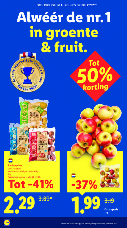 Deze tekst wordt automatisch gegenereerd, dus deze kan fouten bevatten.ONDERZOEKSBUREAU YOUGOV OKTOBER 2025* Alwéér de nr.1 in groente & fruit Tot Ä € Er NU Gov 197 korting ed ARD= APPELEN u) A pus > APPELEN. ® AARD= RAY APP J Zn 39 Lu ez) 1 nn Aardappelen In de varianten restent kruimig en roodschillig pie variëren van €3.89 - €2.89. LT + Tot -41% -37% 3 2.29 TE 2kg Elstar appels Ne © srapport landelijke supermarkten, oktober 202