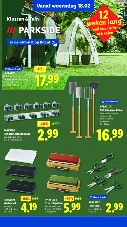 Deze tekst wordt automatisch gegenereerd, dus deze kan fouten bevatten.+ à ri pe QUES, je 1 111] rn ao | D dome mms | s ale A A mg |) al maus PARKSIDE etn RVS tuingereedschap In de varianten spade, schop en riek ups Steel van stevig EERE 112-150 cm 40% Kel PARKSIDE Tuingereedschaphouder Max. belasting: 1,5 kg EL Incl. montagemateriaal 6,99 77 © Vé Cr Ce TA Em — = ES Á 3 1 (Dr men an PARKSIDE PARKSIDE EL Worteldoek PARKSIDE 2-in-1 slijpsteen LOT Met slipvaste basis Tuinschaar 1x10m,2x5m 19 Korrel: 400/800 of BUNT SUCHE 99 en2x3m o 1.000/6.000 599 varianten o