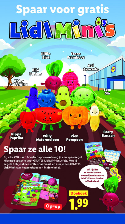 Deze tekst wordt automatisch gegenereerd, dus deze kan fouten bevatten.is Spaar voor grat + m nn Avocado d osbe: Li | Abby, Aubergine en 4 14 M m GE ©) ù Be, > A s à 5 Pippa Barry. Willy CT Banaan 12:1) Watermeloen Pompoen nn © paar ze alle 10 EE Bij elke €10.- aan boodschappen ontvang je een spaarzegel. Hiermee spaar je voor GRATIS LidlMini-knuffels. Met 18 zegels heb je al een volle spaarkaart en kun je een GRATIS LidlMini naar keuze uitzoeken in de winkel. Wiljij alles te weten komen over mij en de andere Mini’s? Scoor dan het we Cn toffe doeboek. =) = a 6 ” 99