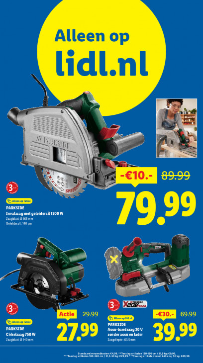 Deze tekst wordt automatisch gegenereerd, dus deze kan fouten bevatten.Alleen op lidlnl N N © a A SI SS I =) SS vi N = ll E er N D =, | > 89-99 CA \ NS 7 > PARKSIDE Invalzaag met geleiderail 1200 W 99 Zaagblad: 9 165 mm Geleiderail: 140 cm EN EN das PS 4 an | \ PA I= ) Z j A di za D e nl Le PE \ PARKSIDE PN Ef CEA acte Le EF PARKSIDE PARKSIDE Accu-bandzaag 20 V Cirkelzaag 750 W EL zonder accu en lader Zaagblad: © 140 mm Zaagdiepte: 63.5 mm 392 *+»Togslag artikelen 180-240 cm / 31,5-50 kg: €29,99. ***Toeslag artikelen vanaf 24 tandaard verzendkosten: €4,99. **Toeslag artikelen 120-180 cm / 31,5 k dl DT