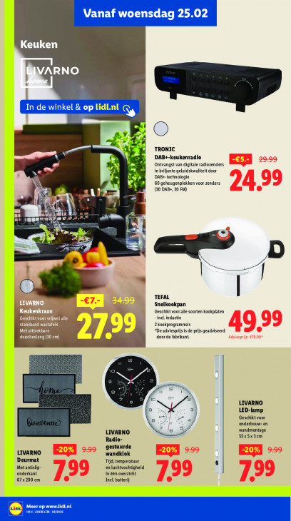 Deze tekst wordt automatisch gegenereerd, dus deze kan fouten bevatten.Vanaf woensdag 25.02 Keuken ARNO [2 In de winkel & op lidl.nl à TRONIC CL DAB+-keukenradio Ontvangst van digitale radiozenders MN in briljante geluidskwaliteit door Nd DAB+-technologie C2 60 geheugenplekken voor zenders (30 DAB+, 30 FM) ET is Pe m CL 2 ee dp ES RN | TEFAL Snelkookpan ik Geschikt voor alle soorten kookplaten - incl. inductie We ha 2 kookprogramma's “De adviesprijs is de prijs geadviseerd doucl lang (30 cm) door de fabrikant 7 ie " Ic EN LIVARNO LED-lamp Geschikt voor ‚onderbouw- en LIVARNO wandmontage Radio- 55x5x3cm gestuurde LIVARNO wandklok Deurmat Tijd, temperatuur . Met antislip- en luchtvochtigheid onderkant in één overzicht 67 x 200 em Incl. batterij Meer op www.lidi.nl El REN are ron
