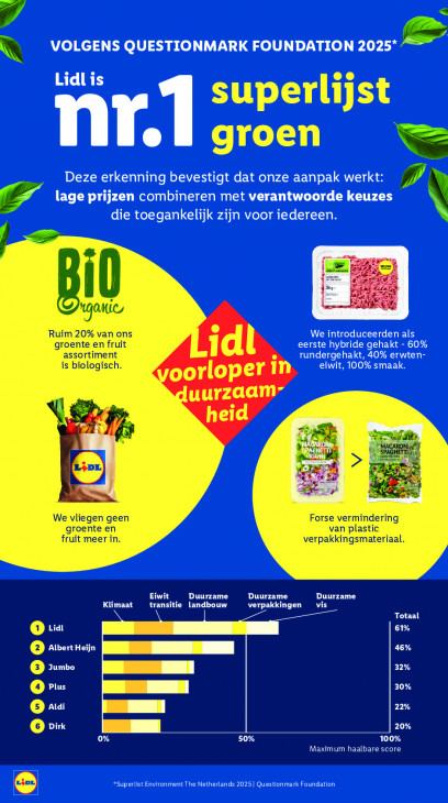 Deze tekst wordt automatisch gegenereerd, dus deze kan fouten bevatten.LS 2 VOLGENS QUESTIONMARK FOUNDATION 2025* 2 N Lidl is superlijst nr. groen Deze erkenning bevestigt dat onze aanpak werkt 17 lage prijzen combineren met verantwoorde keuzes N die toegankelijk zijn voor iedereen m. Bio im 20% van ons We introduceerden als groente en fruit eerste hybride gehakt - 60% assortiment di rundergehakt, 40% erwten- is biologisch eiwit, 100% smaak. oorloper In duurzaam” B heid 4 AE Be MACA "5 SPAGHETTI 5 & We vliegen geen Forse vermindering fruit meer in, groente en van plastic verpakkingsmateriaal Eiwit Duurzame Duurzame Duurzame Klimaat transitie landbouw verpakkingen Mi Totaal 61% © ve 46% © Aiert Hein 32% © rte 30% © Pi 22% 6 Aldi vl OQ voix 0% 50% 100% Maximum haalbare score *Superlist Environment The Netherlands 2025 | Questionmark Foundation Ee